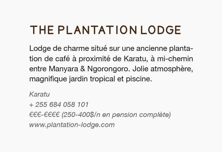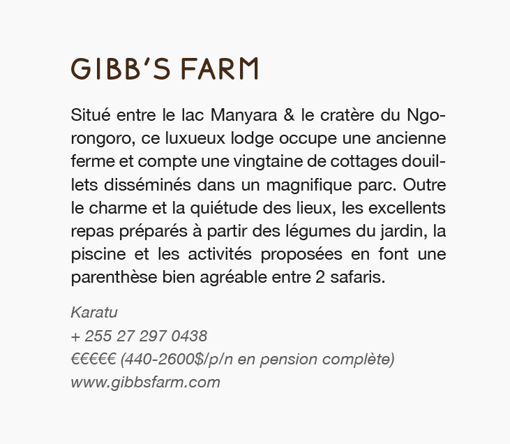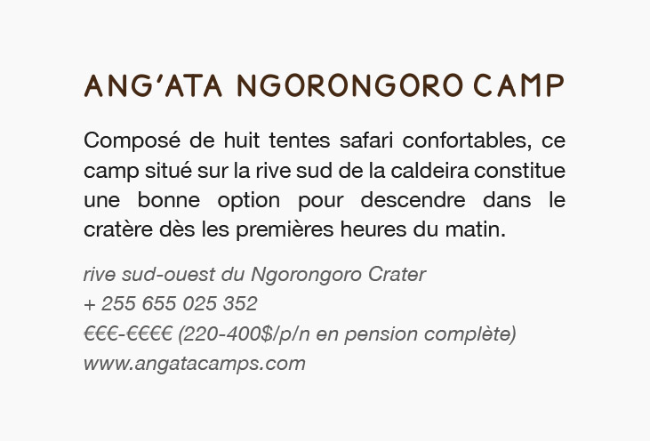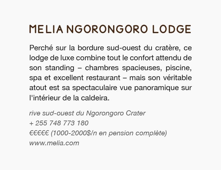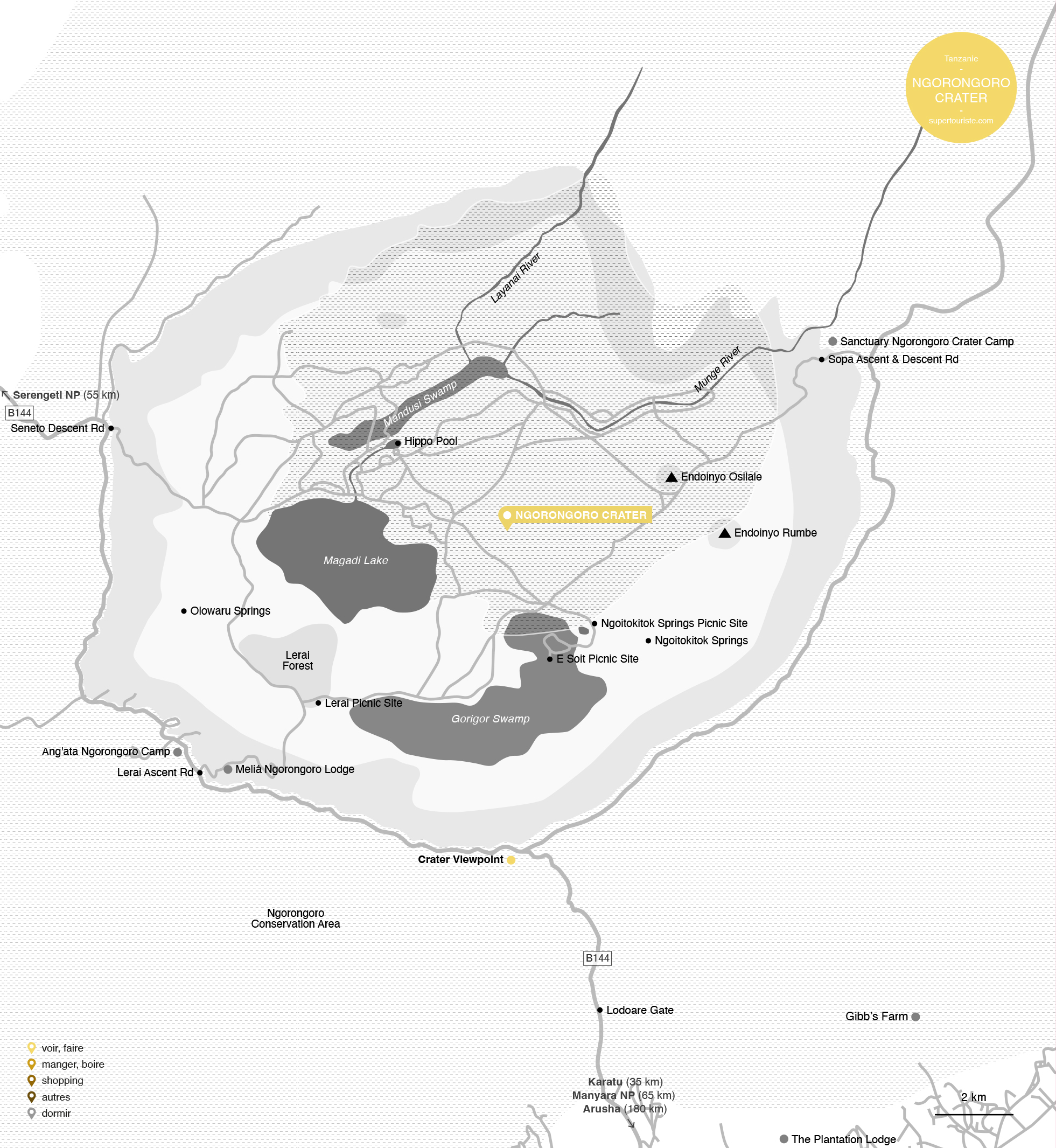 Thumbnail, header, map, Ngorongoro Crater : supertouriste.com, Ang’ata Camp : Ang’ata Camp, Ngorongoro Sanctuary Camp : Abercrombie & Kent, Melia Ngorongoro Lodge : supertouriste.com, Melia, The Plantation Lodge : The Plantation Lodge, Gibb’s Farm : Gibb’s Farm