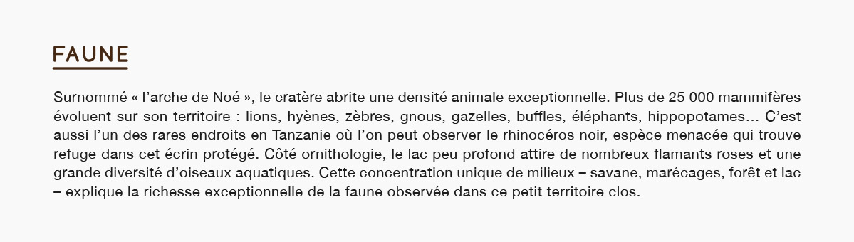Une journée complète suffit en général pour explorer le fond du cratère et observer ses principaux points d’intérêt. Il est conseillé de partir tôt le matin ou en fin d’après-midi, quand la lumière est douce et que les animaux sont les plus visibles.