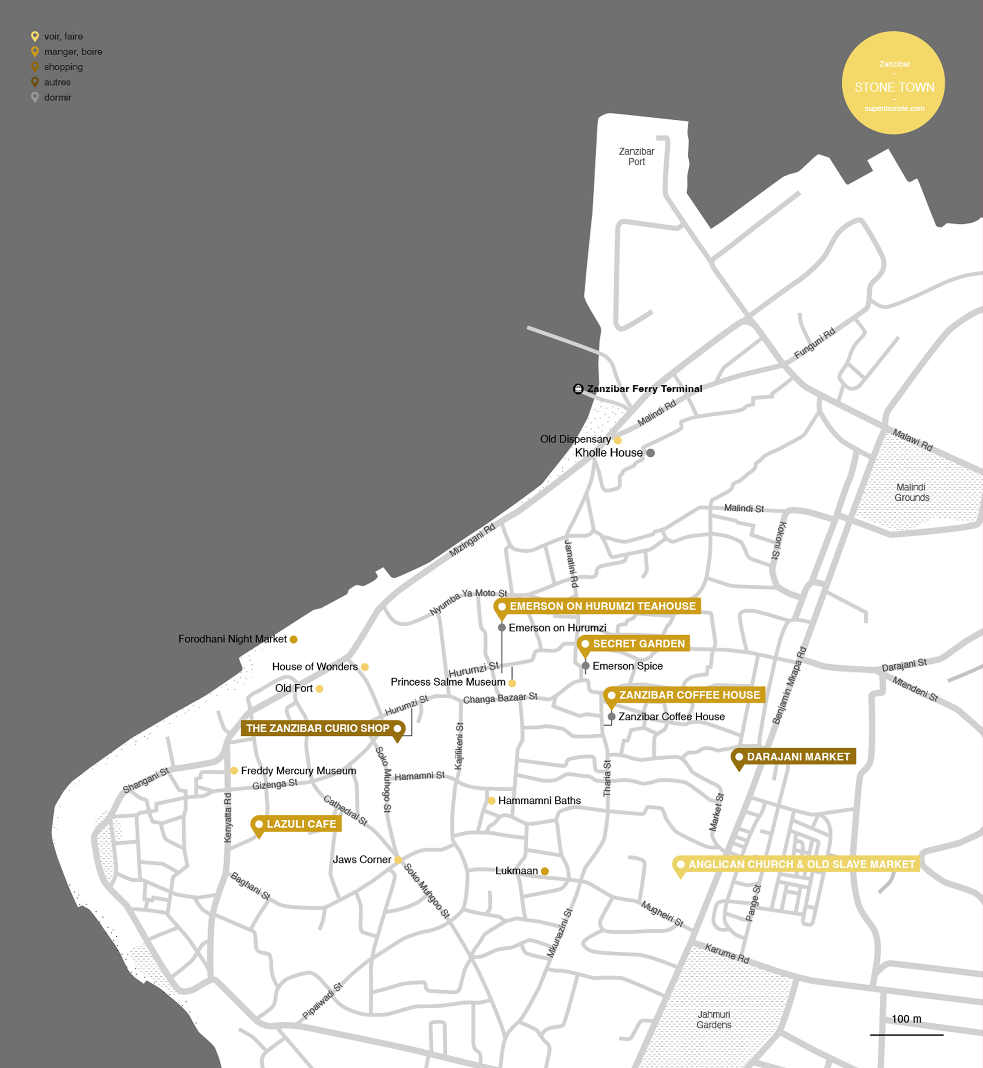 thumbnail, header, map, Stone Town, Anglican Church & Old Slave Market : supertouriste.com, Darajani Market : supertouriste.com, Ventura69 / dreamstime.com, Tore / flickr.com, The Zanzibar Curio Shop, Lazuli Cafe, Zanzibar Coffee House, Secret Garden : supertouriste.com, Emerson on Hurumzi Teahouse : supertouriste, Mori go Beyond